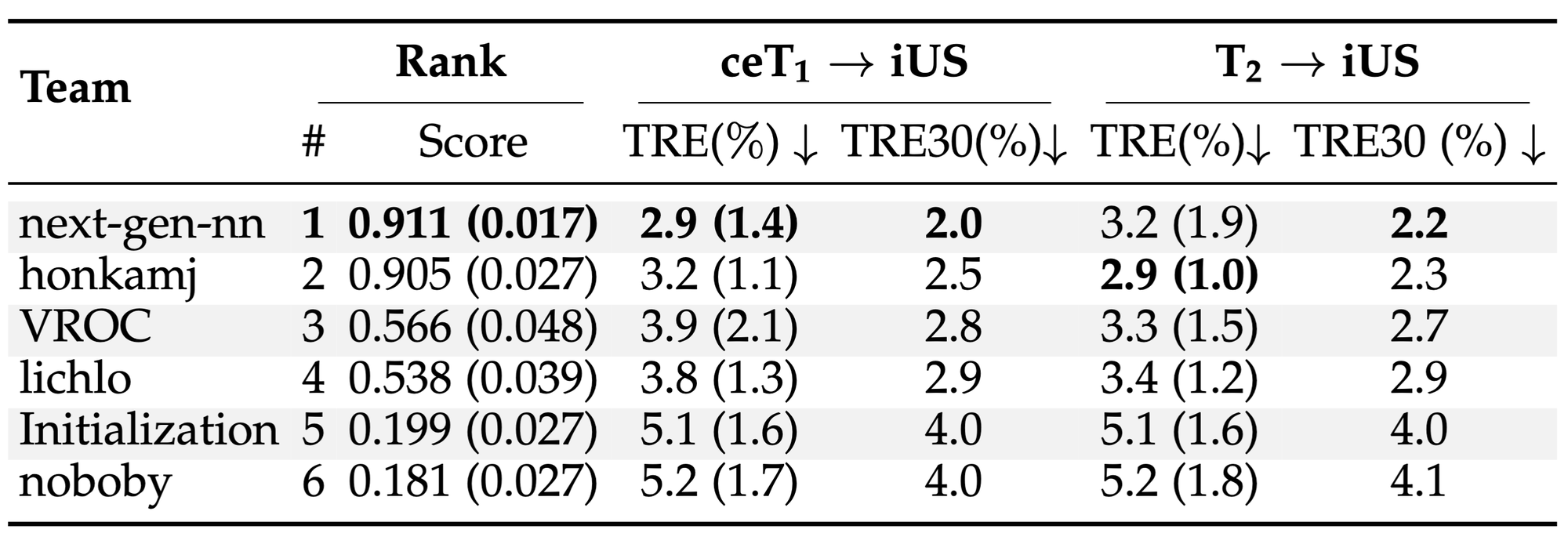 Dataset: The ReMIND2Reg dataset is a pre-processed subset of the ReMIND dataset, which contains pre- and intra-operative data collected on consecutive patients who were surgically treated with image-guided tumor resection between 2018 and 2024 at the Brigham and Women’s Hospital (Boston, USA). The training (N=99) and validation (N=5) cases correspond to a subset of the public version of the ReMIND dataset. Specifically, the training set includes images of 99 patients with 99 3D iUS, 93 ceT1, and 62 T2 and validation images of 5 patients with 5 3D US, 5 ceT1, and 5 T2. The images are paired as described above with one or two image pairs per patient, resulting in 155 image pairs for training and 10 image pairs for validation. The test cases are not publicly available and will remain private. For details on the image acquisition (scanner details, etc.), please see https://doi.org/10.1101/2023.09.14.23295596